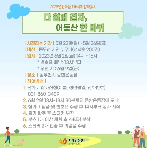 [제주교통복지신문 김강석 기자] 동두천시치매안심센터는 오는 6월 2일, 동두천 종합운동장에서 치매 극복을 위한 ‘다 함께 걷자, 어등산 한 바퀴’ 행사를 개최한다.