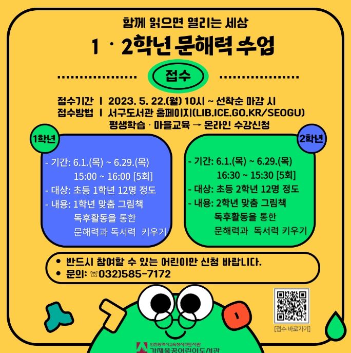 [제주교통복지신문 김강석 기자] 인천광역시교육청서구도서관은 가재울꿈어린이도서관에서 초등 1~2학년 어린이를 대상으로 진행하는 ‘함께 읽으면 열리는 세상’ 어린이 문해력 수업 회원을 22일부터 모집한다.