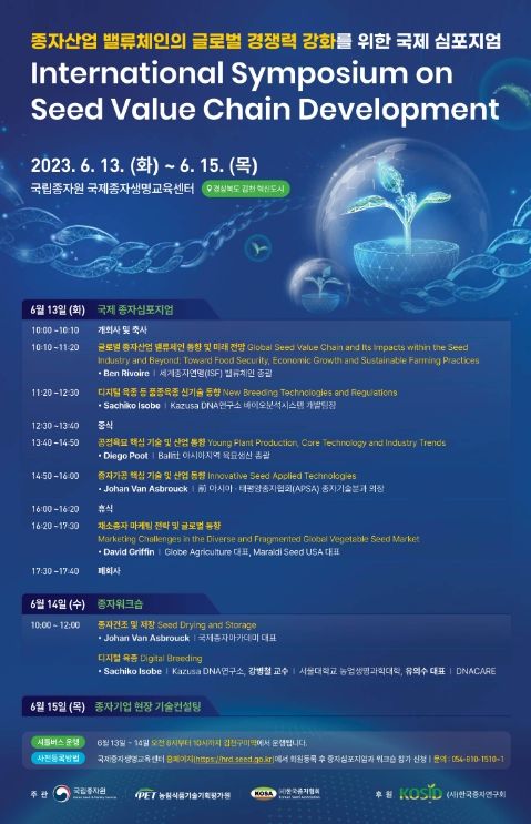 6월 15일에는 이번 국제토론회(심포지엄)에 종자산업분야 국제 권위자들이 초청된 만큼 국내 육종기술 향상과 수출 확대에 도움이 될 수 있도록 2~3개 기업을 대상으로 ‘종자기업 현장 기술컨설팅’도 실시된다.