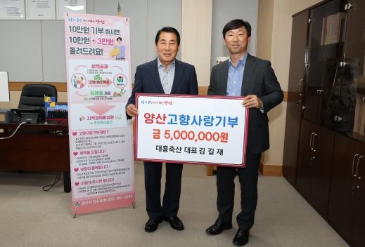 [제주교통복지신문 김강석 기자] 대흥축산 대표 김길재가 양산시에 기부 최대금액인 500만원 기탁하며 고향사랑기부제에 동참했다.