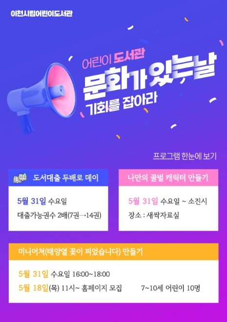 한편 이천시장은 “매달 문화가 있는 날 행사를 통해 어린이들이 다양한 문화를 향유하고 도서관에서 즐거운 시간을 보냈으면 좋겠다”라고 전했다.