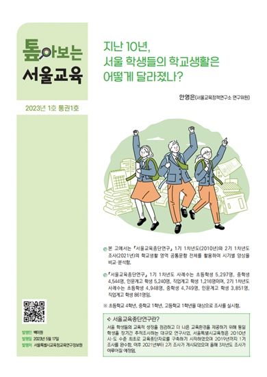 [제주교통복지신문 김강석 기자] 서울특별시교육청 산하 교육연구정보원(원장 백미원) 교육정책연구소는 5월 17일에 ‘지난 10년, 서울 학생들의 학교생활은 어떻게 달라졌나?’라는 제목으로 '톺아보는 서울교육'창간호(통권 1호)를 온라인으로 발간한다.