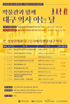 대구근대역사관은 올해 문화체육관광부 공모사업인 ‘박물관 길 위의 인문학’에 선정됐다. ‘박물관과 함께 ‘대구 역사 아는 날’’이란 제목으로, 프로그램은 1부 역사문화강좌 ‘경상감영과 대구읍성에서 만난 대구 역사’(5월~7월), 2부 역사문화 탐방 및 체험 ‘경상감영과 대구읍성 따라 대구 역사 속으로’(8월~11월)로 구성해 총 40여 회 진행한다.