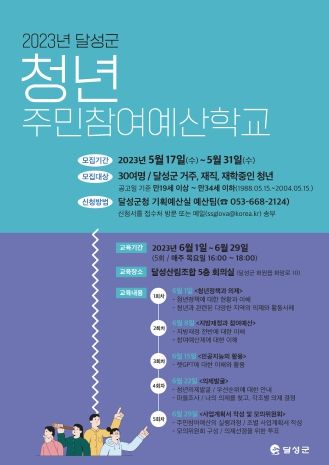 [제주교통복지신문 김강석 기자] 달성군이 오는 31일까지 2023년 달성군 청년 주민참여예산학교 참여 청년을 모집한다.