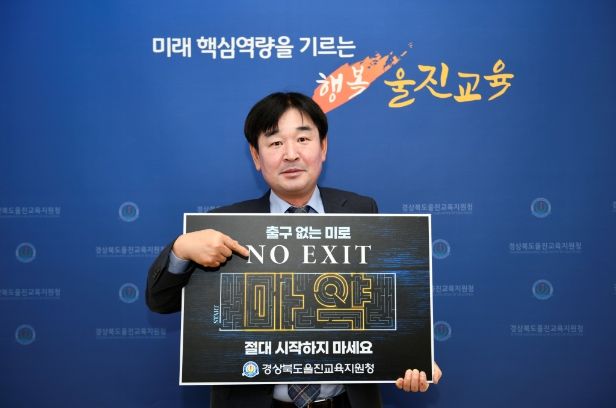 [제주교통복지신문 김강석 기자] 경상북도울진교육지원청은 5월 16일 울진경찰서장의 지목을 받아 마약 범죄 예방을 위한‘NO EXIT’릴레이 캠페인에 동참했다.