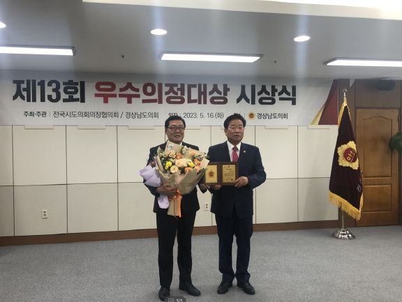 [제주교통복지신문 김강석 기자] 경상남도의회 교육위원회 허용복 의원(국민의힘, 양산6)이 5월 16일 경남도의회에서 열린 ‘대한민국 시도의장협의회 제13회 우수의정대상’을 수상했다. 우수의정대상은 대한민국 시도의장협의회가 지역사회 발전과 주민 삶의 질 향상에 기여한 지방의원에게 시상하는 권위 있는 상이다.