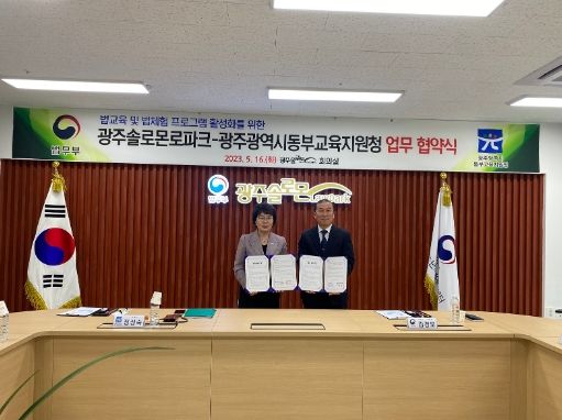[제주교통복지신문 김강석 기자] 광주동부교육지원청이 16일 법무부 산하 ‘광주솔로몬로파크’ 회의실에서 ‘광주동부교육지원청-광주솔로몬로파크’간 업무협약을 체결했다.