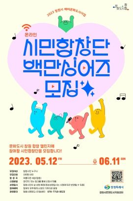 [제주교통복지신문 김강석 기자] 창원특례시는 창원시문화도시지원센터가 창원예비문화도시사업의 일환으로 ‘온라인 시민합창단 100만싱어즈’ 참여자를 6월 11일까지 모집한다고 16일 밝혔다.