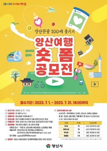 [제주교통복지신문 김강석 기자] 양산시는 다양하고 매력적인 관광지를 최신 감각으로 발굴하여 관광홍보에 활용하기 위하여 숏폼 콘텐츠 공모전을 개최한다고 밝혔다.