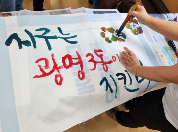 이날 주민자치프로그램 수강생들은 폐현수막과 종이상자에 캘리그래피로 탄소중립 문구를 써넣으며 주민들에게 일상에서 쉽게 할 수 있는 탄소중립 실천 방안을 홍보했다.