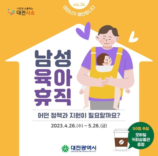 [제주교통복지신문 김강석 기자] 대전시는 육아문제 해결의 일환으로 오는 5월 26일까지 대전시소에서‘남성 육아휴직 어떤 정책과 지원이 필요할까요?’를 주제로 시민 의견을 수렴하고 있다.