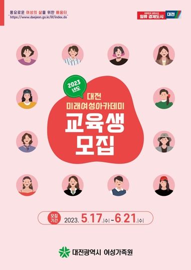 [제주교통복지신문 김강석 기자] 대전여성가족원은 5월 17일부터‘2023년 대전 미래여성아카데미’교육생 100명을 모집한다고 밝혔다.