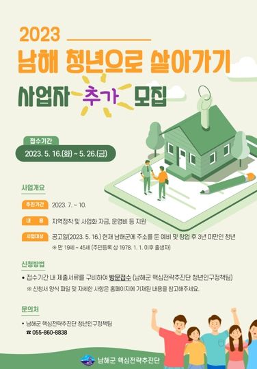 [제주교통복지신문 김강석 기자] 남해군은 ‘2023년 남해청년으로 살아가기(지역정착) 프로젝트’ 사업자를 5월 16일부터 26일까지 10일간 추가 모집한다고 밝혔다.