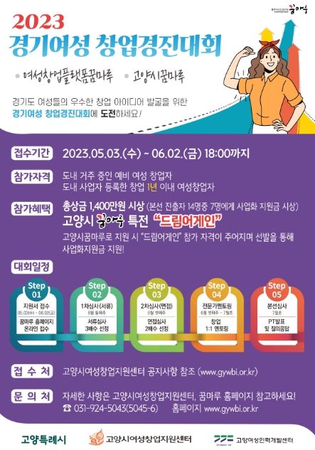 [제주교통복지신문 김강석 기자] 고양시여성창업지원센터가 경기도에 거주하는 여성(예비)창업자와 새내기 여성창업자의 창의적 아이디어 발굴과 창업지원을 위한 ‘2023년 여성창업플랫폼 꿈마루 경기여성 창업경진대회’ 참가자를 모집한다.