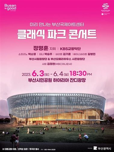 [제주교통복지신문 김강석 기자] 부산시는 오는 6월 3일과 6월 4일 양일간 오후 6시 30분부터 부산시민공원 하야리아 잔디광장에서 '미리 만나는 부산국제아트센터, 클래식 파크 콘서트'를 개최한다고 밝혔다.
