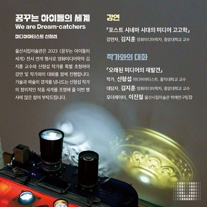 이번 행사는 ‘2023 꿈꾸는 아이들의 세계 전시’ 진행 중인 전(前) 영화사적 광학장치에 바탕을 둔 신형섭 작가의 작품을 영화미디어학 분야의 국제적인 학자인 김지훈 교수가 새롭게 조명하는 자리이다.