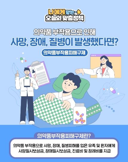 정상적인 의약품 사용에도 예기치 않게 발생하는 부작용 피해를 국가가 보상하는 제도입니다. 환자 또는 유족이 피해구제 신청을 할 수 있습니다.