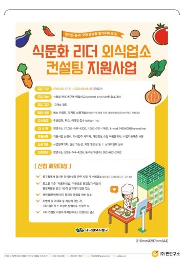 [제주교통복지신문 김강석 기자] 대구 동구청은 오는 6월 5일까지 ‘식문화 리더 외식업소 컨설팅 지원사업’에 참여할 외식업소 10개소를 모집한다.