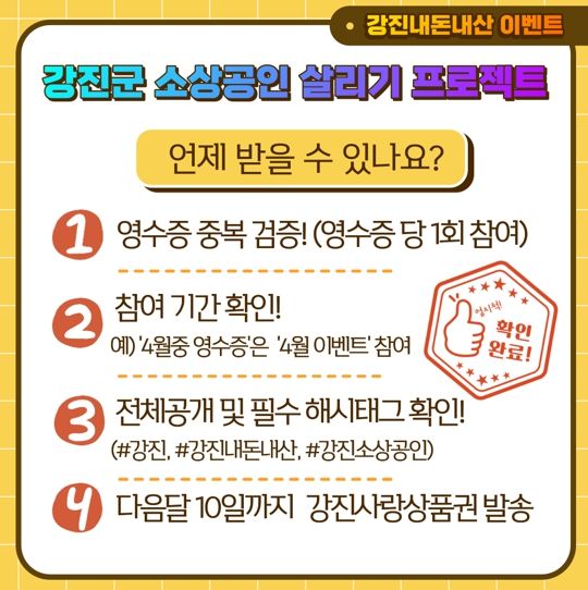 [제주교통복지신문 김강석 기자] 강진군은 관내 소상공인 업체 이용 후 SNS 게시하면 강진사랑상품권(모바일) 5천 원을 지급하는 ‘강진 내돈내산 이벤트’를 연중 추진 중이라고 밝혔다.