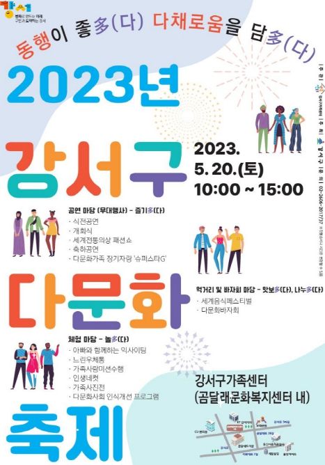 [제주교통복지신문 김강석 기자] 서울 강서구는 오는 20일 오전 10시부터 오후 3시까지 화곡동 곰달래문화복지센터(강서로5길 50)에서 ‘2023 다문화 축제 및 가족행사’를 개최한다.