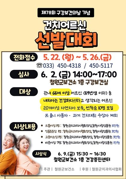 [제주교통복지신문 김강석 기자] 철원군보건소는 제78회 구강보건의날을 맞이하여 구강건강관리에 대한 지역주민 인식 제고 및 건강생활실천 분위기를 조성하고자 건치(건강한 치아)어르신 선발대회를 개최한다.