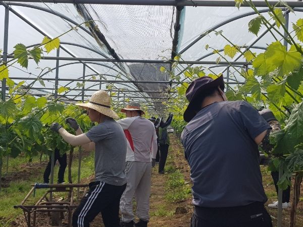 이번 농촌 일손 돕기에서 일손 부족으로 농번기에 어려움을 겪고 있는 농가를 찾아 포도밭에서 포도 순 따기 작업 등 구슬땀을 흘렸다.