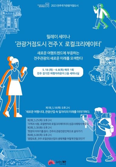 전주시는 관광 창업의 새로운 모델과 방식을 논의하고, 로컬창업에 대한 아이디어 발굴을 위해 18일부터 오는 6월 1일까지 ‘관광거점도시 전주×로컬 크리에이터 릴레이 세미나’를 개최한다.