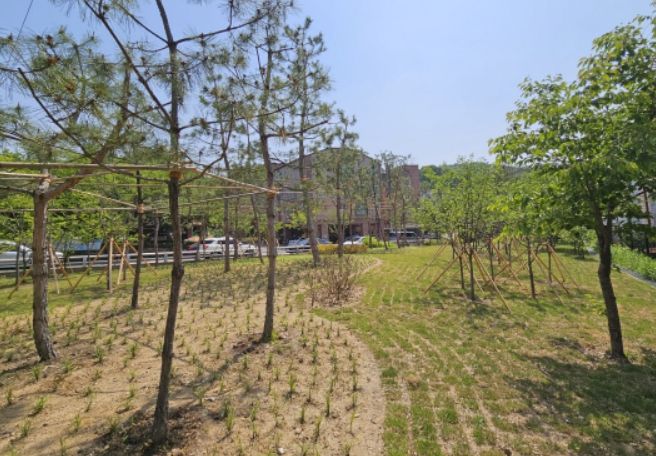 주요 사업내용은 배수불량 해결을 위한 마운딩을 조성하고, 기존 수목 이식 및 산딸나무 등 교목 33주, 산철쭉 150주, 맥문동, 잔디 등을 심어 경관을 개선했다.