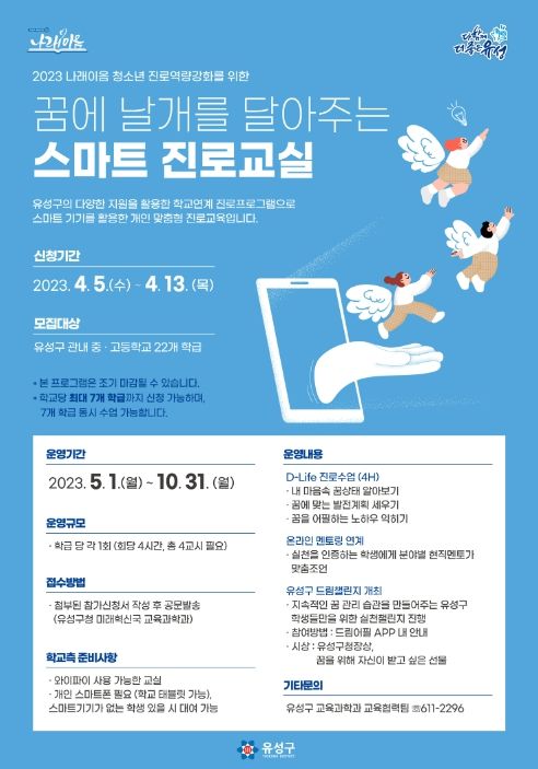 정용래 유성구청장은 “스마트 진로교실은 모바일로 내 꿈을 관리하고 실천을 인증하며 자기주도적 진로관리 역량을 키울 수 있는 차세대 진로 프로그램”이라며, “앞으로도 학생들의 진로선택에 실질적인 도움이 될 수 있도록 흥미와 적성을 고려한 다양한 프로그램을 지속적으로 개발·운영하겠다”라고 말했다.