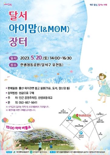 [제주교통복지신문 김강석 기자] 대구 달서구는 오는 20일에 한샘청동공원에서 중고 출산・육아용품을 판매하는‘달서 아이맘(I&MOM) 장터‘를 운영한다고 밝혔다.