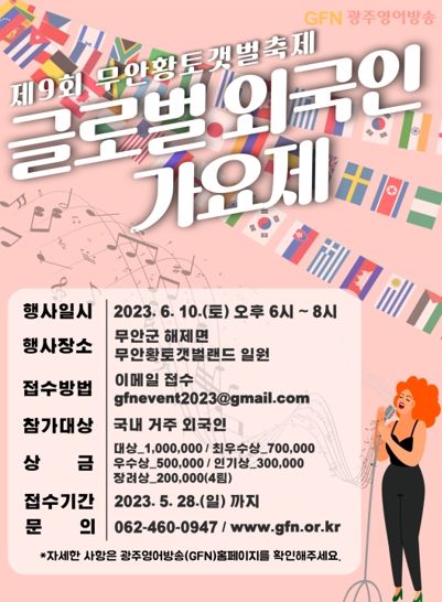 [제주교통복지신문 김강석 기자] 무안군축제추진위원회는 4년 만에 대면으로 개최하는 제9회 무안황토갯벌축제에서 전국의 외국인이 참여할 수 있는 ‘무안 글로벌 외국인 가요제’를 오는 6월 10일 18시에 황토갯벌랜드 주무대에서 개최한다고 밝혔다.