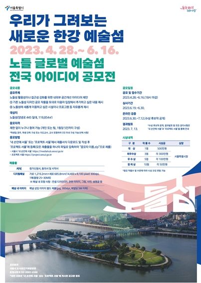 한편, 서울시는 노들섬의 매력을 시민들과 함께 공감하고, 시민들이 원하는 시설용도, 프로그램 등을 함께 고민하기 위해 '우리가 그려보는 한강 예술섬'이라는 주제로 오는 6월 16일까지 시민 아이디어 공모전을 진행 중이다. 연령 및 거주지 제한 없이 누구나 참여할 수 있으며, 공모 접수는 ‘내 손안에 서울’ 또는 ‘프로젝트 서울’을 통해 신청서 양식과 서약서 등을 다운 받아, ‘프로젝트 서울’로 접수하면 된다.
