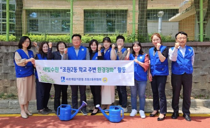 조원2동 바르게살기위원회 위원들은 지난달 꽃을 심었던 수일고등학교 뒤편 마을정원에서 화초에 물을 주고 무단투기 쓰레기를 줍는 활동을 진행했다.