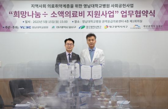 [제주교통복지신문 김강석 기자] 대구 수성구와 영남대학교병원이 지난 15일 지역사회 의료취약계층을 위한 민·관 협력사업인 ‘희망나눔(÷) 소액의료비 지원 사업’ 협약을 체결했다.