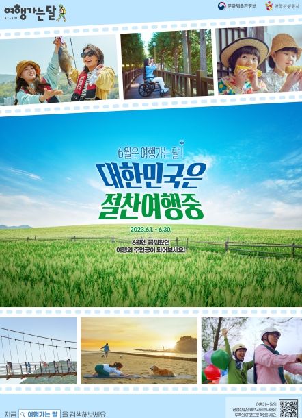 [제주교통복지신문 김강석 기자] ‘여행가는 달’ 6월, 국민들의 여행을 응원할 다양한 할인 혜택과 이벤트가 쏟아진다. 문화체육관광부는 한국관광공사(사장 김장실, 이하 관광공사)와 함께 6월 1일부터 30일까지 ‘2023년 여행가는 달’을 추진한다. 올해는 대한민국 구석구석 여행으로 나만의 여행 버킷리스트를 완성하고, 영화처럼 멋진 여행의 주인공이 되자는 의미를 담아 ‘대한민국은 절찬 여행 중’을 주제로 진행한다.