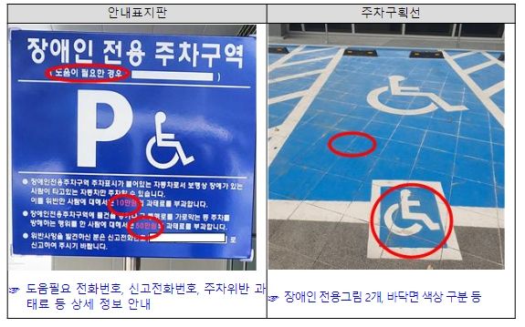 이로 인해 도로·여객시설의 장애인 전용 주차구역 안내판에 ‘주차방해 시 50만원의 과태료가 부과된다.’는 내용이 없거나, 장애인 도움 전화번호 등이 적혀있지 않은 사례가 많았다.
