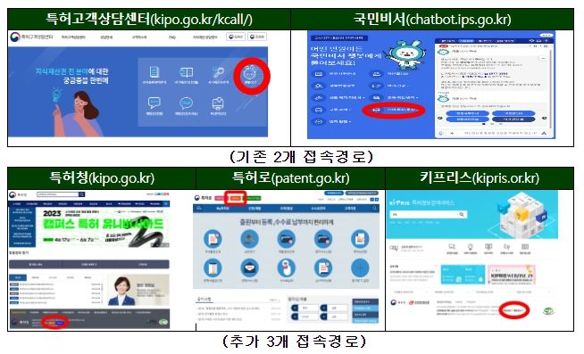 ❶챗봇상담 서비스의 접속창구를 기존 2개(특허고객상담센터, 국민비서 누리집)에서 5개(특허청, 특허로, 키프리스 누리집 추가)로 확대하여 사용자의 접근성을 강화하고,