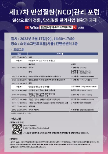 [제주교통복지신문 김강석 기자] 질병관리청은 5월 17일에 서울 스위스그랜드 호텔에서 만성질환 예방관리 정책 개발과 개선 과제 도출을 위해 「제17차 만성질환 관리 포럼」을 개최한다.