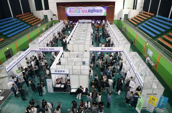‘특성화고 ZONE(이하 특성화고존)’과 ‘청년 ZONE(이하 청년존)’으로 나누어 진행된 이번 행사에서 특성화고존에서는 △이모티브 △비앤테크 △유진금속공업 △디에스피 등 의생명·미래차 관련 분야 기업 17개사가 관내 특성화고 학생을 대상으로 채용면접과 기업홍보를 진행했다.