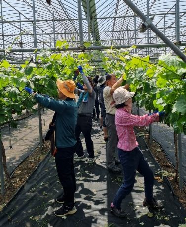 이날 직원들은 아침 일찍 농가를 방문하여 농가주로부터 영농교육을 받고, 포도 꽃송이 정리 및 순 따기 작업에 임하며 농가에 실질적으로 도움을 주고자 구슬땀을 흘렸다.