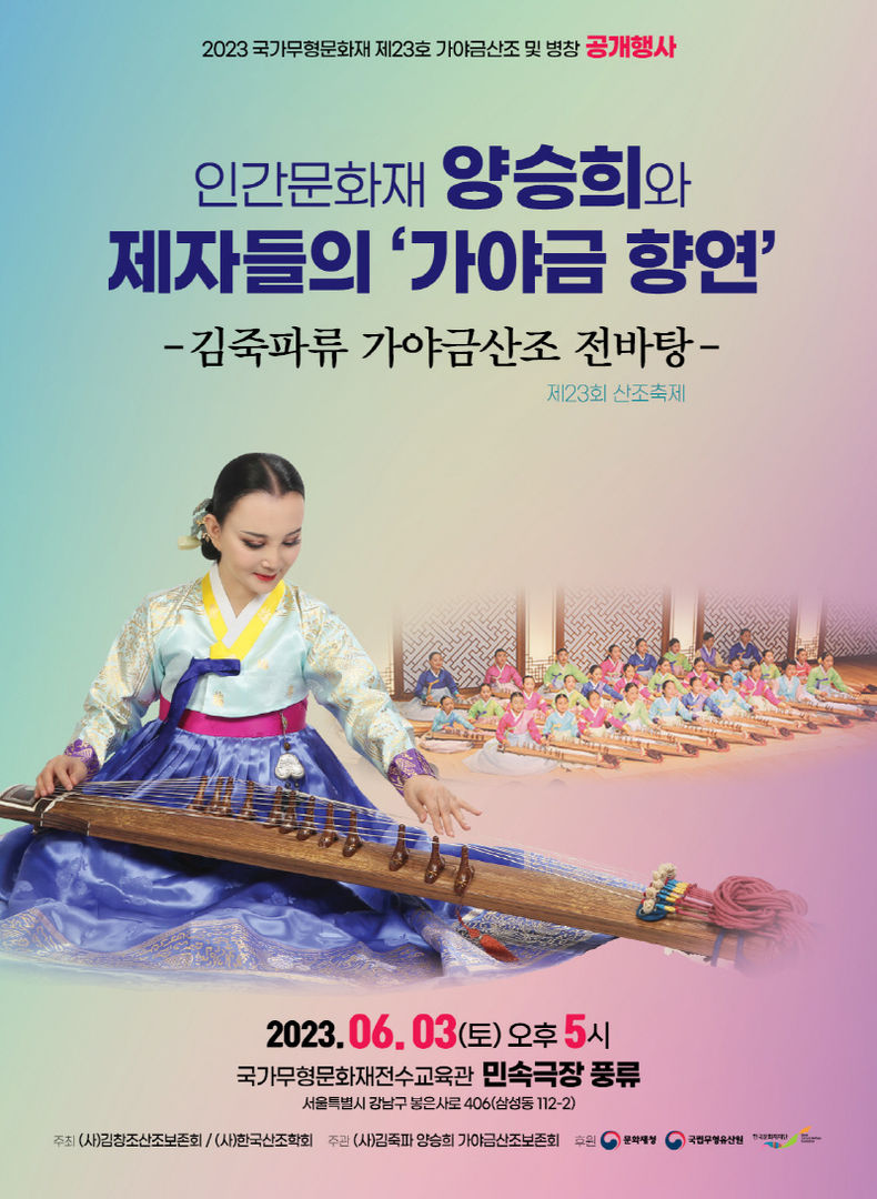 [제주교통복지신문 김강석 기자] 인간문화재 양승희와 제자들의 ‘가야금 향연’이 국가무형문화재전수관 민속극장 풍류에서 오는 6월 3일(토) 오후 5시에 펼쳐진다.