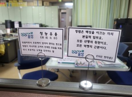 이번 시책의 일환으로 지난 1일부터 매월 청렴 문구를 선정해 책상 위에 놓고 자연스럽게 청렴 정신 및 몸가짐을 배우고 실천하는 자체 청렴시책을 특수시책으로 병행 추진함에 따라 청렴문화 조성에 적극 기여하고 있다.