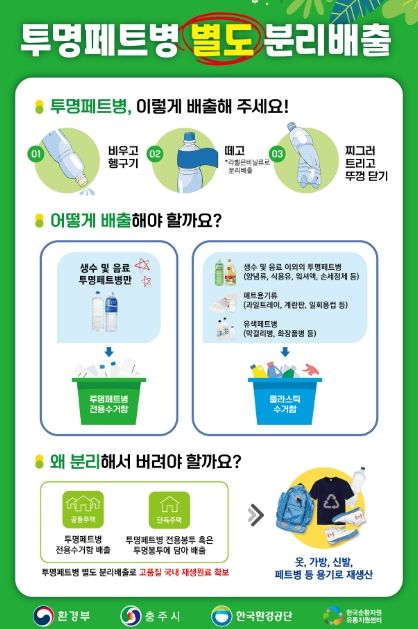 또한, 집중 홍보 기간 중 환경부 및 충청북도, 환경공단과 함께 공동주택과 단독주택 지역 기획점검을 통해 투명페트병 별도 배출제 실태를 파악하고 행정지도와 홍보를 통해 관리를 강화할 예정이다.