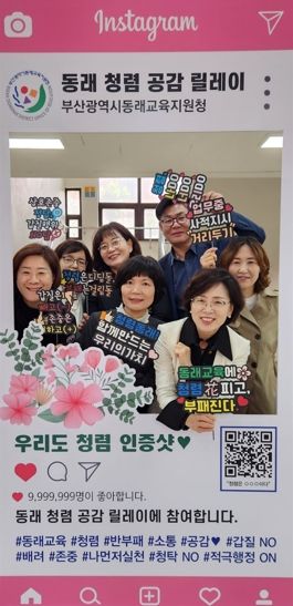 [제주교통복지신문 김강석 기자] 부산광역시동래교육지원청은 5월 중순부터 7월까지 관내 학교 구성원들이 참여하는 ‘청렴 포토존 인증샷 릴레이’를 운영한다고 18일 밝혔다.