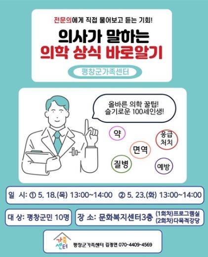 [제주교통복지신문 김강석 기자] 평창군이 지원하는 평창군가족센터는 5월 18일, 5월 23일 총 2회에 걸쳐‘의사가 말하는 의학상식 바로알기 사업’을 시행한다.