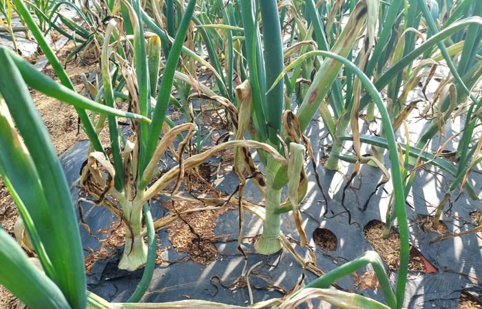 양파의 피해 증상으로는 잎에 백색 또는 짙은 회색곰팡이가 생기고 심할 경우 잎이 구부러지며 뒤틀리며, 마늘 잎의 경우 적갈색의 병반이나 흑갈색의 병반이 형성되고 심하면 병반이 상하로 확대되어 잎끝 또는 엽맥까지 변색한다.