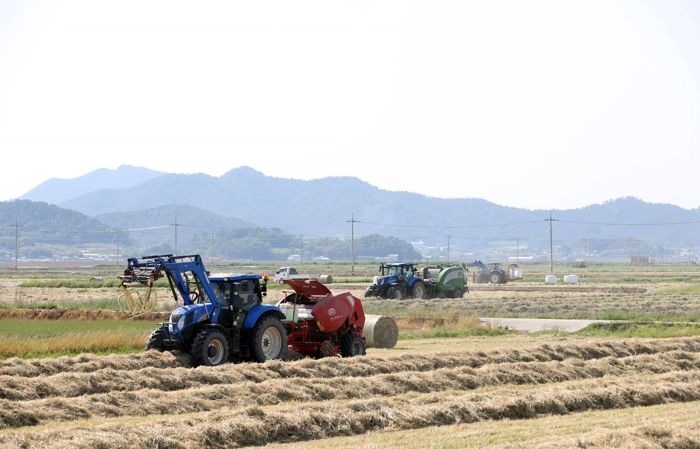[제주교통복지신문 김강석 기자] 이른 더위가 기승을 부린 지난 16일, 전남 영암군 서호면 몽해들녘에서 농민들이 일명 ‘공룡알’로 불리는 소 먹이용 조사료 수확으로 구슬땀을 흘렸다.