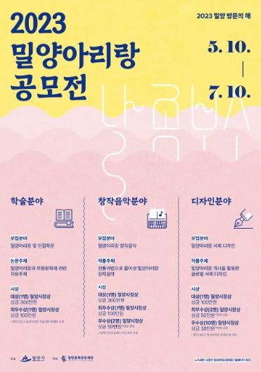 다양한 우수 콘텐츠 확보로 밀양아리랑 활성화에 목표를 둔 이번 공모전은 학술·창작음악·디자인(가사) 등 모두 3개 분야에 ‘밀양아리랑’에 관심 있는 사람이라면 누구나 참가할 수 있다. 또한 해외참가자 공개모집으로 밀양아리랑 글로벌 브랜드화에도 앞장선다.