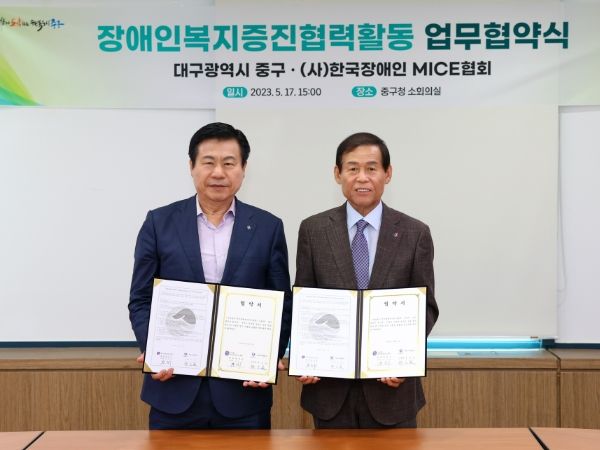 [제주교통복지신문 김강석 기자] 대구 중구청은 지난 17일 중구청 소회의실에서 사단법인 한국장애인마이스협회(회장 장상수)와 장애인복지증진 협력 활동을 위한 업무협약을 체결했다.