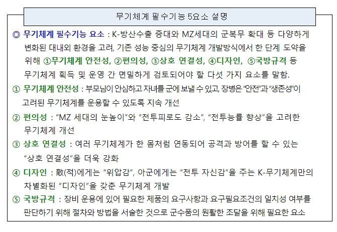현재 방위사업청은 무기체계의 연구개발뿐만 아니라, 이미 전력화가 완료된 장비의 작전효율성을 높이기 위해『무기체계 필수기능 5요소』를 정의하여 지속적으로 개선소요를 발굴하는 등 운용자 중심의 지원활동을 적극적으로 펼치고 있다.